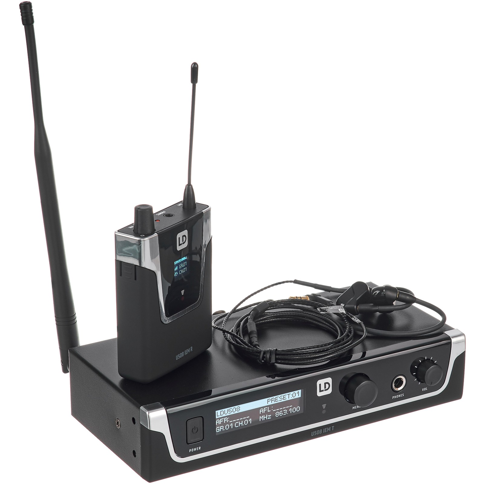 The LD Systems U508 IEM HP wireless in-ear monitoring system represents a further development of the company’s best-selling MEI 1000 G2 system. Comprising a stationary transmitter, a pocket receiver, and an in-ear headset, it allows wireless transmissions to be made over distances of up to 100 metres, and the system comes at a budget-friendly price. It delivers a good price-performance ratio by combining affordability with professional features such as infrared synchronisation and adjustable noise limiting (squelch), and the transmitter is of course equipped with balanced XLR/jack combo sockets. In addition to the bright OLED displays on both the body pack and the receiver, another attractive feature is that the bundle also includes a rack kit and transport case – accessories that are unusual for wireless systems at the “budget” price point.
