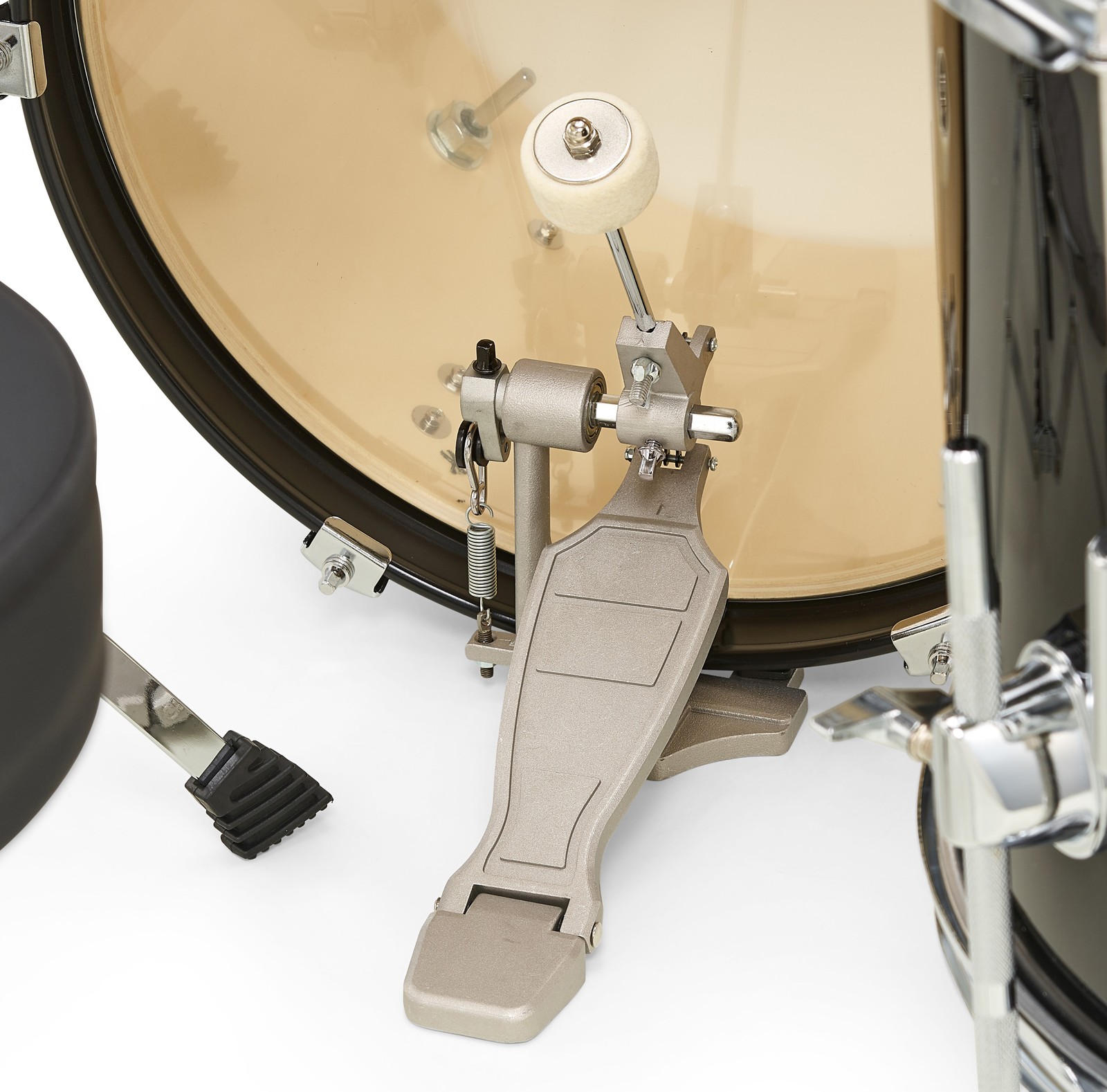 The features and accessories of the Millenium Focus Junior Drum Set Black are impressive! The included cymbals ensure that little drummers can start rocking right away. The hi-hat and bass drum pedals feature a durable chain drive, and the chrome-plated, single-braced hardware is stable and durable. In practice, the included bass drum pillow also proves to be a valuable add-on: On the one hand, it eliminates the often unwanted, high-frequency "boing" sound when hitting an unmuffled bass drum; on the other hand, depending on the positioning and alignment, both the batter and the resonant head can be muffled. This gives the bass drum sound more punch and improves the playing feel with the pedal.