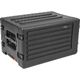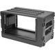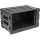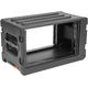 SKB R6SW Shallow Roto Rolling Rack - Double door rack with trolley function; vertical height units: 6U; with “one-touch” pull handle; recessed butterfly locks; two side handles; rack rails at front and rear; incl. rackmount screw set; water-repellent seal; mounted wheels on the bottom; stackable design; non-slip rubber feet; Housing material: hard plastic; installation depth: 272 mm; external dimensions (WxDxH): 431 x 369 x 626 mm; weight: 13.4 kg; color: black